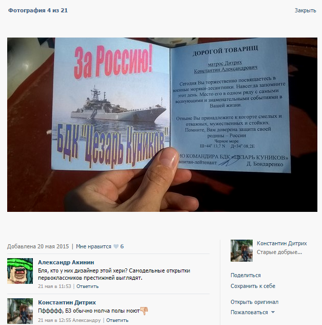 Проверяя профили друзей Артамонова, группы в которых они состоят, мы натолкнулись на профиль Константина (сохранённая копия). В его профиле нас привлекла самая свежая на тот момент фотография, на которой была изображена погрузка на БДК «Цезарь Куников» (б/н 158), с подписью «снова в Сирию»: