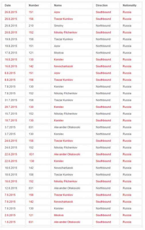 Строки с красным текстом указывают, что корабль двигался на юг (т.е. в том же направлении, где и Сирия, хотя и не обязательно именно к ней). Строки с чёрным текстом указывают, что корабль двигался на север (в сторону России). Данная таблица совпадает и с новостью, что 26 августа в Тартус прибывала российская военная делегация, которая договаривалась с сирийскими войсками о технологической помощи им.