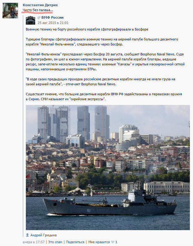 Вчера Константин также дополнительно отметил тот факт, что в прессе обнаружили, зафиксировали переброску военной техники в сторону Сирии (в процитированной им новости речь идёт о БДК «Николай Фильченков», б/н 152 - далее мы докажем, что два этих БДК ходили в Сирию друг за другом):