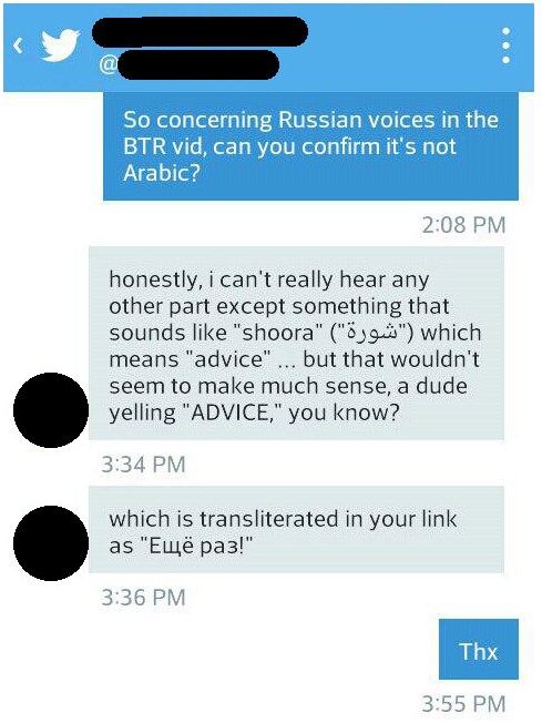 Но, во-первых, это более старая модель, которая сильно отличается от БТР-82А, во-вторых, на фотографиях БТР-80 в Сирии видно, что они имеют простейшую заводскую окраску, в-третьих, как видно из фотографий: сирийцы не наносят бортовые номера на поставленную им технику. Мы дополнительно проверили этот момент и убедились, что если сирийцы на какую-либо военную технику наносят бортовые номера, то они используют другое начертание цифр.