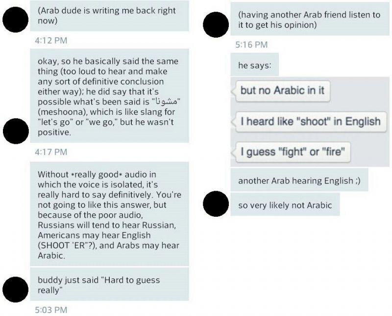 Затем мы попросили нескольких арабов (не людей, знающих арабский язык, а именно носителей языка) послушать отрезок с видео и сказать, что они слышат. Вот какой был результат: