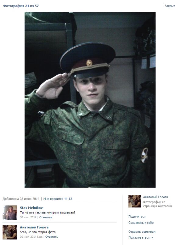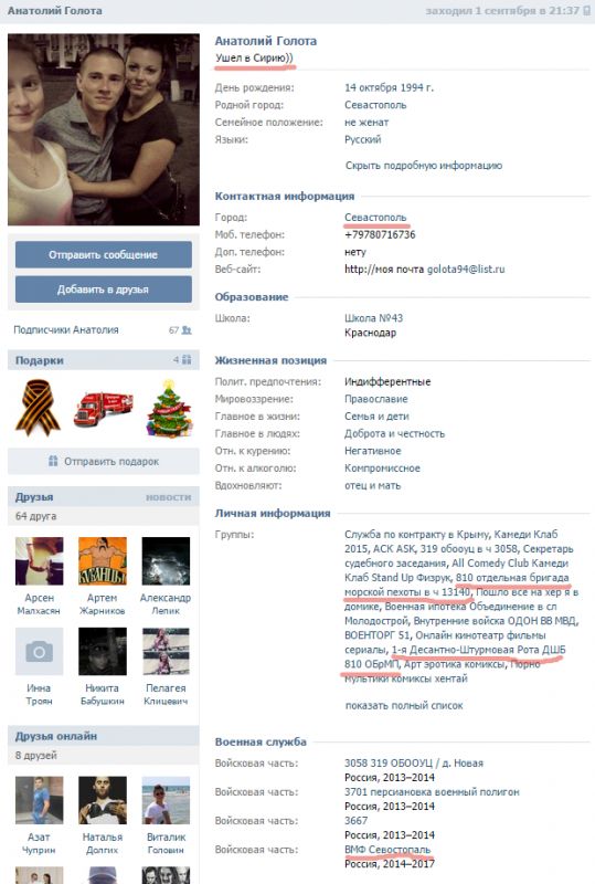 В ходе дальнейших поисков сослуживцев морпехов, мы нашли профиль Голота Анатолия, у которого в статусе значится «ушёл в Сирию))»: