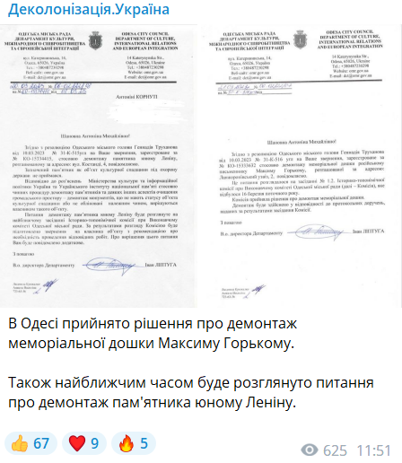 В Одессе горсовет принял решение о демонтаже мемориальной доски писателю Максиму Горькому. Об этом сообщает проект "Деколонизация Украина".