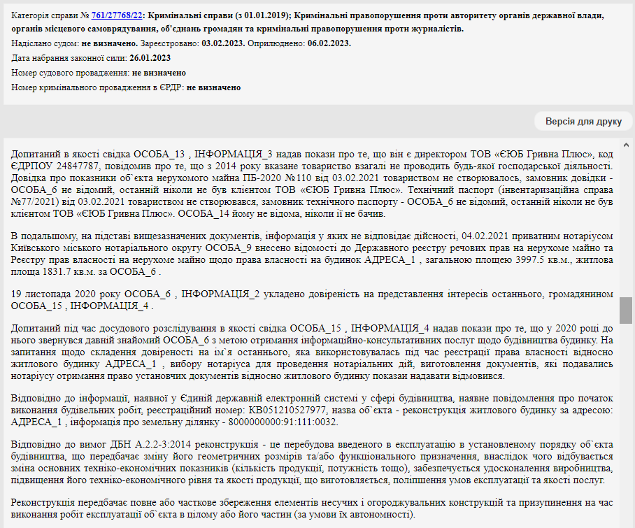 В ходе следствия правоохранители установили, что жилой дом по вышеуказанному адресу возводится незаконно и что это привело к повреждению памятника архитектуры. При этом следователи отмечают, что данные работы проводят неустановленные ими лица. Также правоохранители выяснили, что частный нотариус Киевского городского нотариального округа (его имя и фамилия в судебных определениях по этому производству "засекречены". - ) в нарушение требований действующего законодательства 4 февраля 2021 осуществил регистрацию права собственности в отношении упомянутого здания - без наличия каких-либо правоучредительных документов и на основании поддельного технического паспорта.