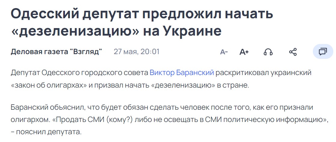 Кого-то эта история напоминает, не так ли? Но если с олигархом, сделавшим из игрока членом на рояле президента, такой вывод из-под удара понятен и объясним, то кто подсунул Зеленскому в списках на лишение гражданства Баранского, который этого самого Зеленского ненавидит лютой ненавистью и даже публично предлагал начать «дезеленизацию» страны?