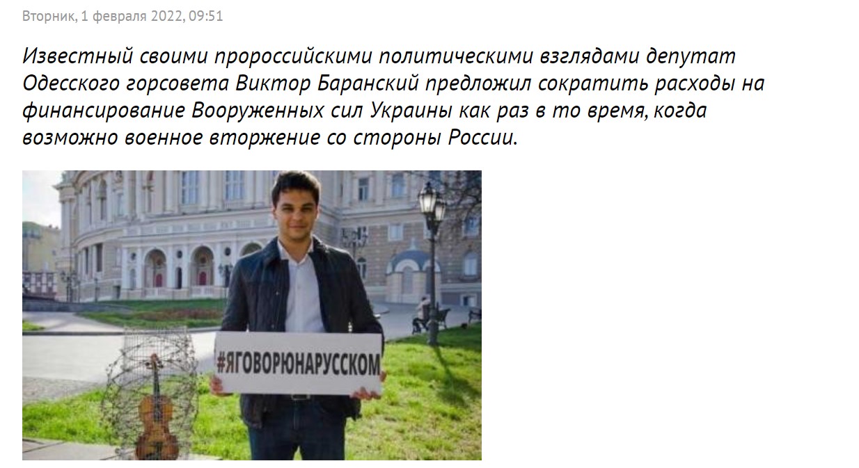Не менее странно выглядит ситуация в связи с внутренней деятельностью Виктора Баранского. Не далее как в начале февраля 2022 года депутат Одесского городского совета от ОПЗЖ Виктор Баранский предложил урезать финансирование ВСУ.