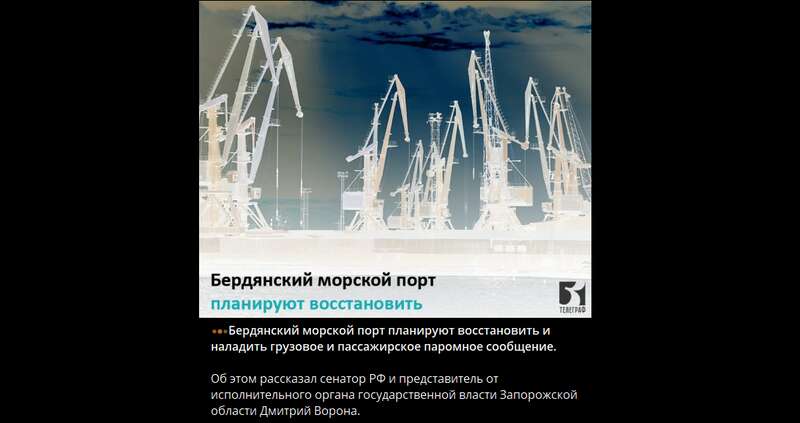 На временно оккупированной части Запорожской области россияне ротами своих муртадов уже второй год рассказывают чушь. И о возобновлении полноценной работы Бердянского морского торгового порта, и, как только представьте, о налаживании пассажирского и паромного сообщения с оккупированным Крымом и Сочи.