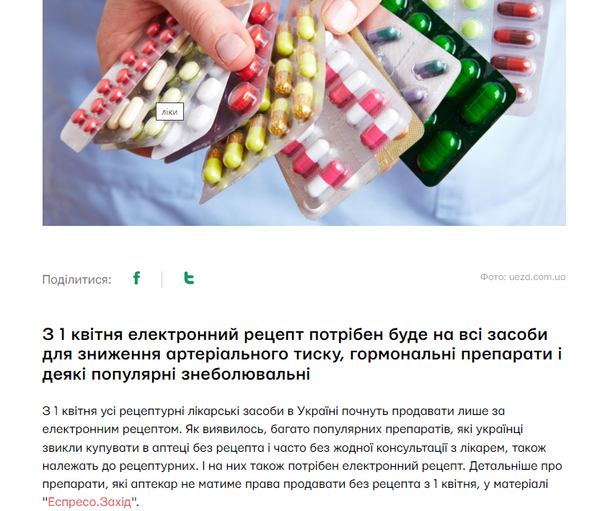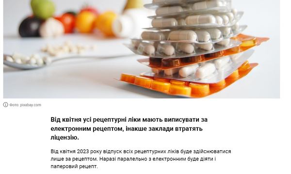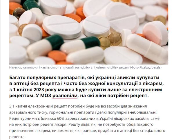 В этой статье утверждается, что "с 1 апреля все рецептурные лекарственные средства в Украине начнут продавать только по электронному рецепту". Кроме того, этой некорректной информации добавлено драматизма утверждением: "Как оказалось, многие популярные препараты, которые украинцы привыкли покупать в аптеке без рецепта и часто без консультации с врачом, также относятся к рецептурным. И на них также нужен электронный рецепт". В то же время читателю не объясняют, что "как оказалось" касается только людей, участвовавших в создании материала. Давно известный факт, хорошо или не очень разъясненный Министерством здравоохранения, стал ли неожиданностью для редакции, был ли сознательно представлен как новость ради того, чтобы эмоционально нагрузить текст. Но и этого создателям материала показалось маловато и они добавили: "Подробнее о препаратах, которые аптекарь не будет иметь права продавать без рецепта с 1 апреля".