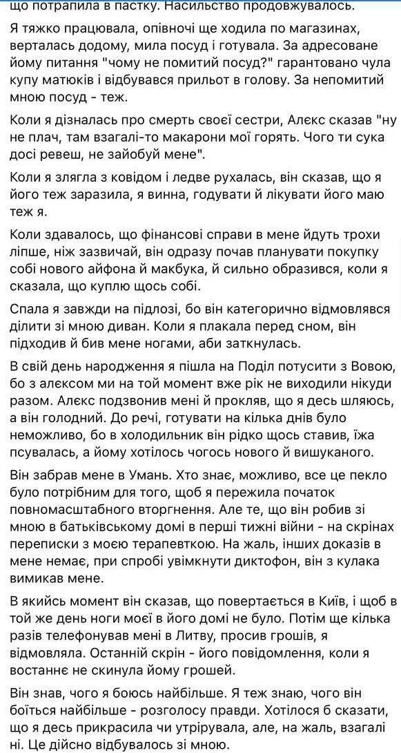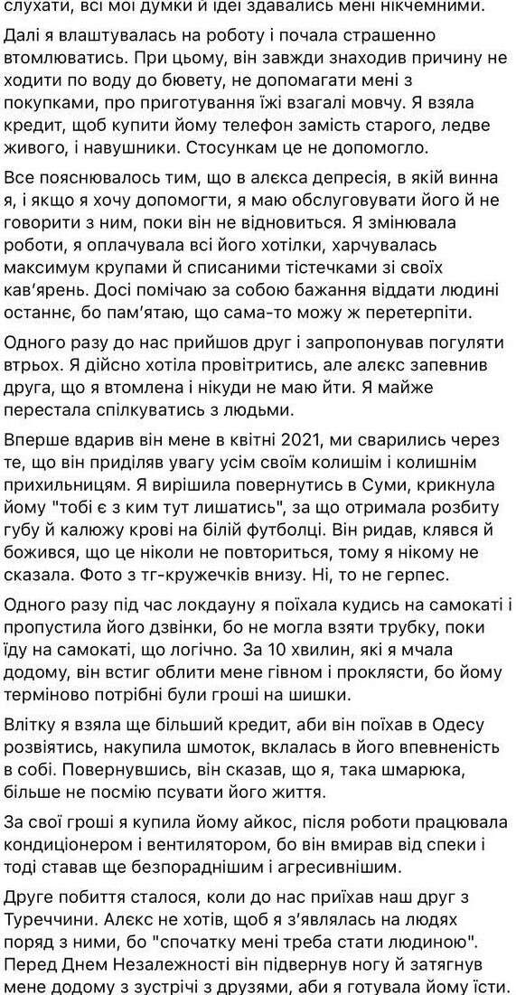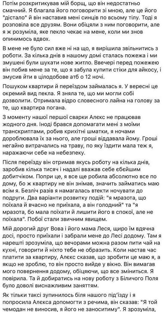 "Перед Днем независимости он подвернул ногу и затащил меня домой со встречи с друзьями, чтобы я готовила ему есть. Потом раскритиковал мой борщ, что он недостаточно вкусный. Я умоляла его поговорить со мной, но это его "достало", и он наставил мне синяков по всему телу. Тогда я рассказала все друзьям. Они обещали с ним поговорить. Но я же понимала, какой ад ожидает меня, когда мы снова окажемся вдвоем. А через несколько дней в нашем доме произошел пожар, и мы вынуждены были искать новое жилье. Вечером перед пожаром он избил меня за то, что я забыла купить стики для айкоса и заставил идти в круглосуточное АТБ в двенадцать ночи", - пишет девушка.