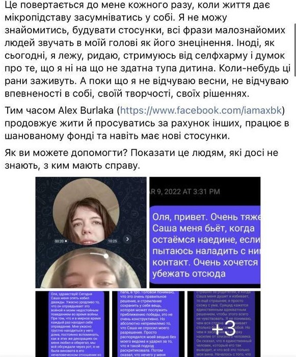 Аналитик фонда помощи армии "Повернись живим" Александр Бурлака регулярно избивал свою девушку. Об этом рассказала его бывшая девушка - Надежда Сазонова - у себя на странице в Facebook.