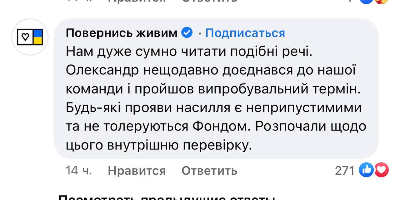 "Нам очень грустно читать подобные вещи. Александр недавно присоединился к нашей команде и прошел испытательный срок. Любые проявления насилия недопустимы и не толерируются в фонде. Начали относительно этого внутреннюю проверку", — написали "Повернись живим".