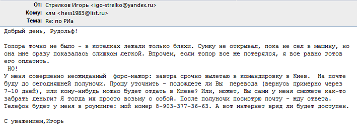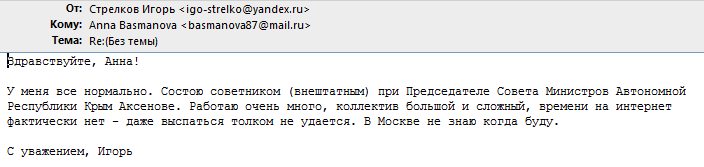 Часть писем этого периода посвящена подготовке обращений к народу Крыма и Востока Украины, но большую часть переписки составляют анонимные угрозы, пожелания удачи и новостные рассылки. Похоже на то, что часть писем была удалена хакерами и, возможно, будет опубликована позже. Впрочем, не исключено, что переписка может быть частично подделана, ведь проверить ее подлинность достаточно сложно. Как и доподлинно узнать — кем же является Стрелок на самом деле.