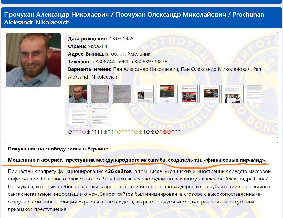 Александр Пан-Прочухан находится в базе «Миротворца», где ему вменяют создание финансовых пирамид и связи с россиянами: