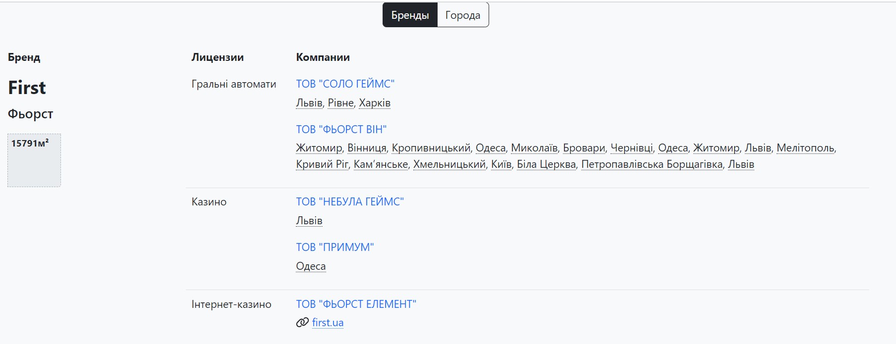Все они напрямую связаны с брендом First Casino и Артемом Юшковым. Если мы посмотрим на перечень компаний, имеющих право организовывать азартные игры в Украине по состоянию на апрель 2022 года, то увидим следующие названия:
