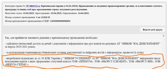 Постановление суда от 21 февраля указывает на возможную связь финансовых пирамид с компаниями "ЗНВКІФ"УСПІШНИЙ" и "ЗНВКІФ "ЮА ДЕВЕЛОПМЕНТ" и необходимость проверить происхождение средств, из которых сформирован уставной капитал компаний ТОВ «ПРИМУМ», ТОВ «ФЬОРСТ ЕЛЕМЕНТ», ТОВ «ФЬОРСТ ВІН», ТОВ «НЕБУЛА ГЕЙМС».