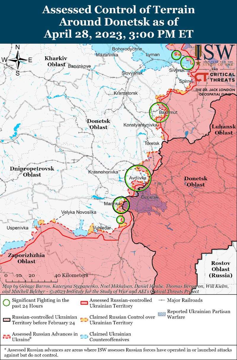 "Институт изучения войны" (США) проанализировал фото и видео с фронта. Кадры, опубликованные 28 апреля, показывают, российские войска продвигаются под Кременной. На фото армию РФ видно примерно в 10 километрах к северо-западу от города.