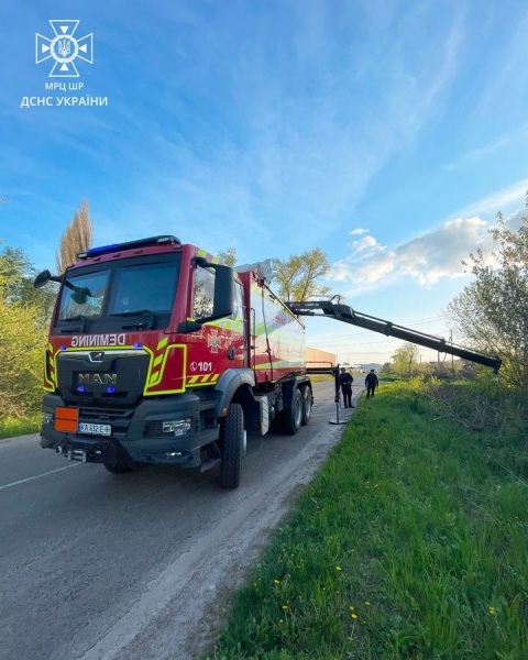 Спасатели Киевской области обнаружили и ликвидировали остатки российской ракеты Х-55. Для этого была использована пиротехническая машина тяжелого типа.
