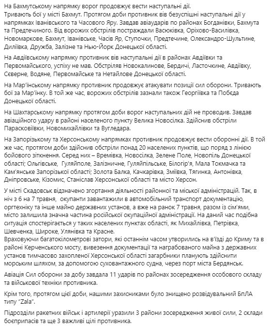 Об этом сообщается в воскресенье, 7 мая, в вечерней сводке Генштаба ВСУ в Facebook.