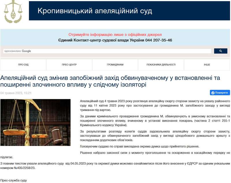 Соответствующее решение 4 мая 2023 г. постановила коллегия служителей Фемиды в составе председательствующей судьи Ирины Алексеенко и судей-участников - Виктора Онуфриева и Руслана Бондарчука.