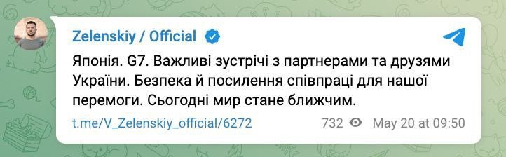"Япония. G7. Важные встречи с партнерами и друзьями Украины. Безопасность и усиление сотрудничества для нашей победы. Сегодня мир станет ближе", - отметил президент.