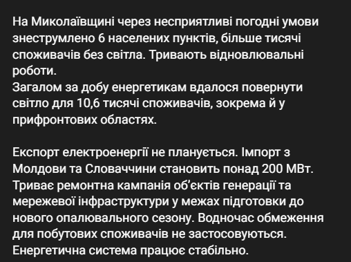 В министерстве заявляют, что это не связано с ночной атакой, повреждений энергетической инфраструктуры нет. Отмечается, что из-за технологических нарушений зафиксировано отключение 5 тысяч потребителей в столице и окрестностях.
