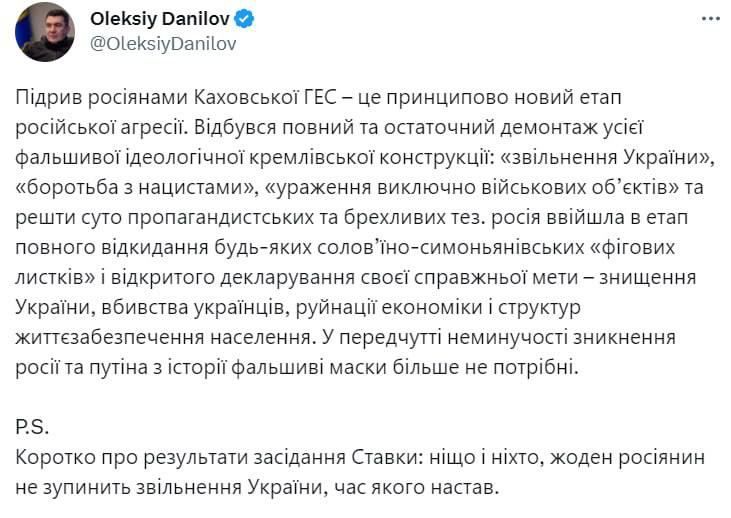 "Кратко о результатах заседания СНБО - ничто и никто, ни один россиянин не остановит увольнение Украины, время которого наступило", - написал секретарь Совета национальной безопасности Алексей Данилов.