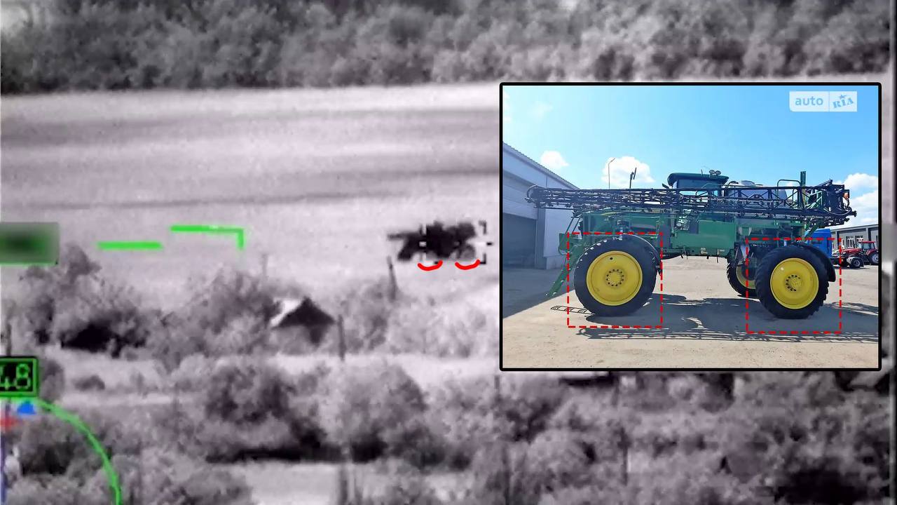 Однако OSINT-сообщество раскрыло очередную российскую ложь. Уничтоженной техникой действительно оказались комбайны на опрыскиватели фирмы John Deere.