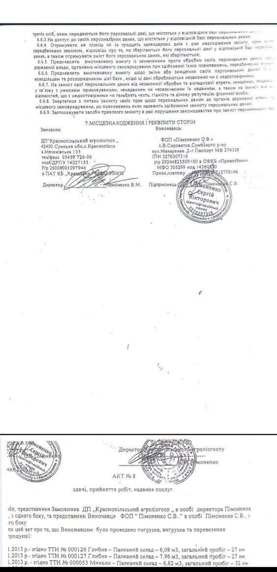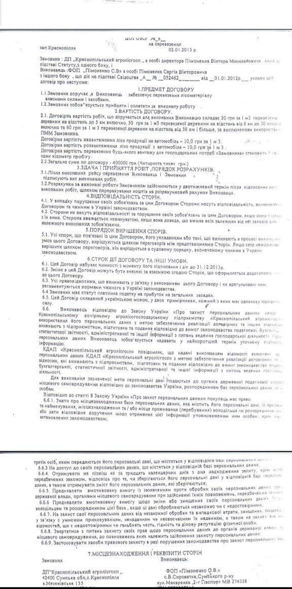 Зачем? Всё очень просто. В январе 2013 между ДП «Краснопольский агролесхоз» в лице директора Пимоненко Виктора Петровича и ФЛП Пимоненко Сергея Викторовича заключен договор, внимание, на перевозку лесометериала.
