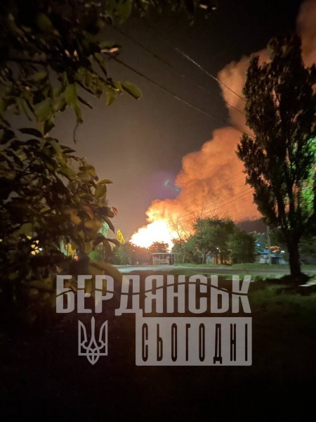 Также в сети публикуют фото и видео с места происшествия в Бердянске. На кадрах виден большой столб дыма и зарево от пожара после взрыва.