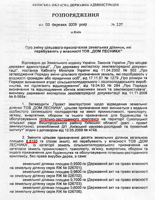 Цими розпорядженнями міняється цільове призначення 20 земельних ділянок для ТОВ “Дім лісника” (лісові землі) з земель сільськогосподарського призначення на землі промисловості для будівництва та обслуговування готельно-ресторанного комплексу.