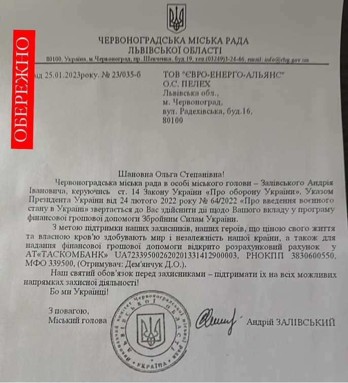 Вопиющий случай произошел в январе 2023 года, когда в Червонограде мошенники от имени городского головы рассылали "официальные письма" с просьбой перечислить деньги на указанный банковский счет. И все это было "красиво" украшено фразой "Наше святое обязательство перед защитниками – поддержать их на всех возможных направлениях защитной деятельности". Похожие ситуации были зафиксированы и в других районах Львовщины.