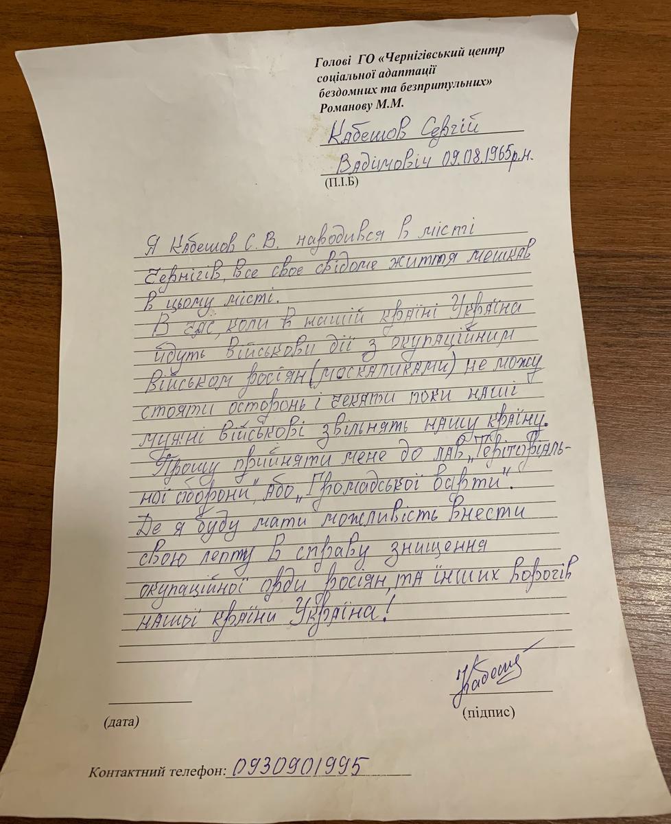 «Я, Кабешев Сергей Вадимович, родился в городе Чернигове, всю свою сознательную жизнь жил в этом городе. В час, когда в нашей стране Украине идут военные действия с оккупационными войсками россиян (москаликами), не могу стоять в стороне и ждать, пока наши мужественные военные освободят страну. Прошу принять меня в ряды территориальной обороны или «Громадской варты», где я буду иметь возможность внести свою лепту в дело уничтожения оккупационной орды россиян и других врагов нашей страны Украины!»