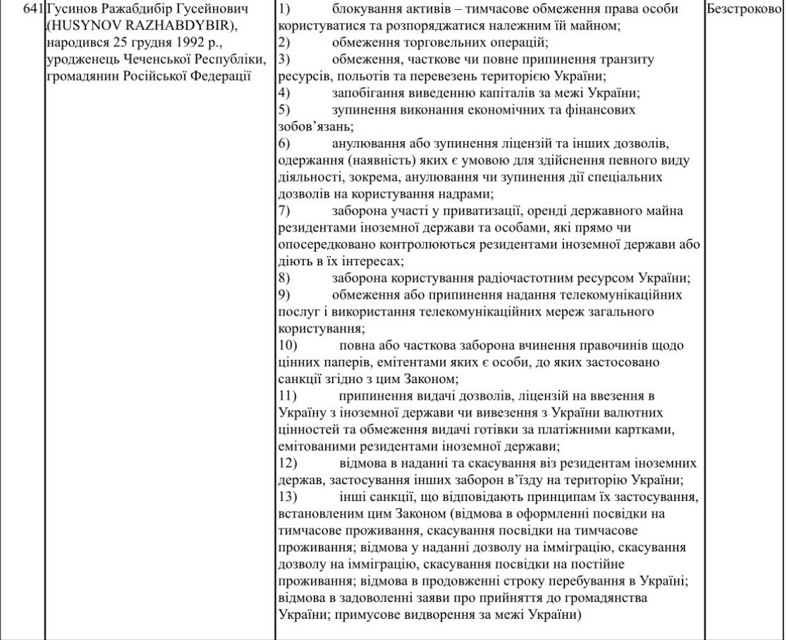 Вдобавок к этому, Ражабдибир Гусинов от мая 2021 года под №641 был внесен в перечень уголовных элементов в Украине, в отношении которых применены санкции СНБО .