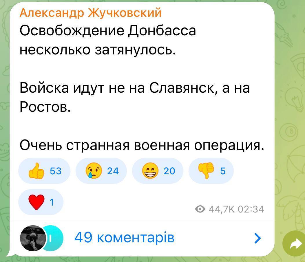 "Освобождение Донбасса несколько затянулось. Войска идут не на Славянск, а на Ростов. Очень странная военная операция", – написал он.