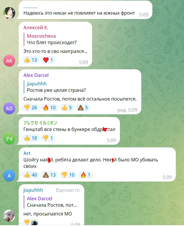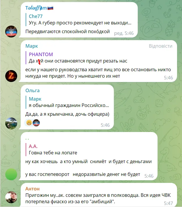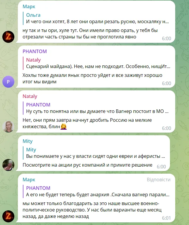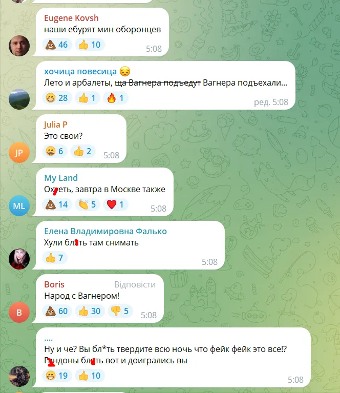 "Доигрались в зерновые сделки,с*ки!!!!", "Вот дураки-то из-за х*хлов внутри страны драться", "Пригожин му..ак. совсем заигрался в полководца. Вся идея ЧВК потерпела фиаско из-за его "амбиций", "Если у нашего руководства хватит яиц это все остановить никто никуда не придет. Но у нынешнего их нет", "мы может только благодарить за это наше высшее военно-политическое руководство. У нас были варианты еще месяц назад, да даже неделю назад", – бьются в истерике граждане РФ.