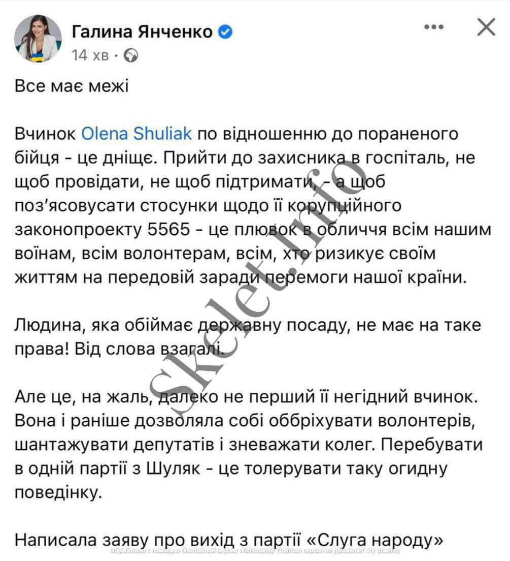 Но лично для Шуляк самые тяжелые последствия имел скандал вокруг её законопроекта №5655 «О внесении изменений в некоторые законодательные акты Украины о реформировании сферы градостроительной деятельности», поданный в рамках антикоррупционной реформы строительной отрасли. На самом деле всё сводилось к давней борьбе Шуляк против ГАСИ с целью сократит расходы застройщиков, интересы которых она лоббирует. Всё это было столь очевидно, что законопроект вызвал шквал критики не только среди работников отрасли и журналистов, но и общественности. И что же Шуляк? А она поступила также, как и в случае с «Великим будівництвом»: бросилась его отчаянно защищать. И вот в декабре 2022-го Шуляк буквально ворвалась в военный госпиталь, где лечился потерявший ноги боец Олег Симороз, высказавшийся в Facebook, что законопроект №5655 принят в интересах строительной мафии. Подчеркнем: боец защищал не просто Украину, но и конкретно её власть, «слуг народа», включая Елену Шуляк, он вернулся с войны инвалидом. А в благодарность за это председатель президентской партии устроил ему разнос прямо в палате госпиталя! Выходка Шуляк вызвала бурю эмоциональных возмущений, однако осталась безнаказанной – что красноречиво говорило о том, что команда ОП стоит выше всех тех национальных и общественных ценностей, которые рекламирует в своих видеообращениях Зеленский. И она не дает в обиду своих, иначе бы Елена Шуляк уже давно оказалась в мусорном баке, облитая зеленкой. Неужели весь этот «патриотический спектакль» разыгран только для простых украинцев?