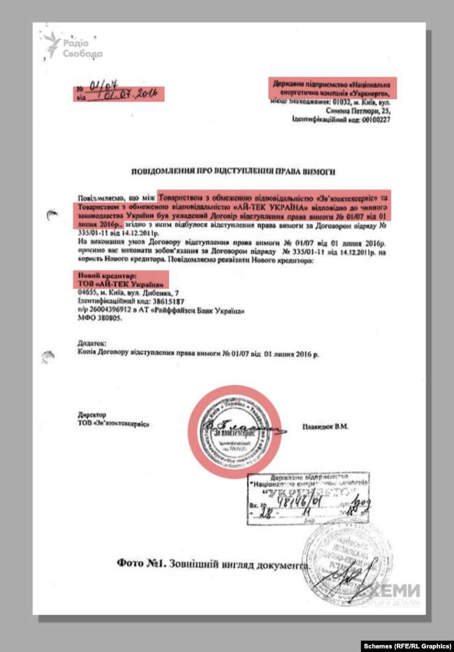 Второе, на что обратили внимание журналисты – это сообщение от Ай-Тека, адресованное «Укрэнерго» в 2020 году, что фирма якобы еще 4 года назад подписала договор на уступку права требования.