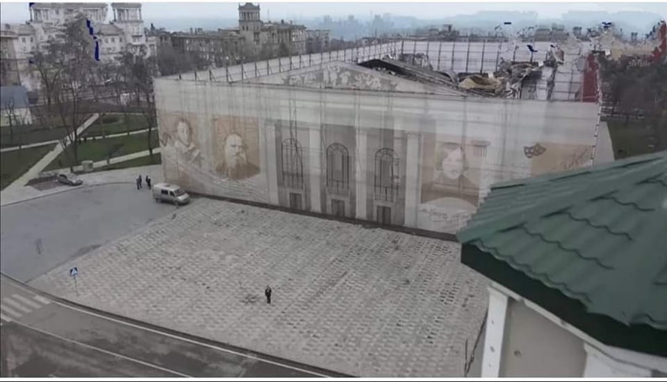 Разрушенное авиаударом здание Донецкого драматического театра, рядом с которым была сделана огромная надпись на русском «Дети», стала одним из символов российских военных преступлений. В подвале театра прятались дети с родителями, большинство из которых погибли.