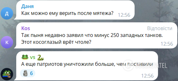 "А танки Пригожина, которые по М4 (трасса с Ростова на Москву. – Ред.) ехали, почему не уничтожили?" "И все HIMARS, и все Bayraktar, и вытеснили всех Пригожиных", "Как можно ему верить после мятежа?" – пишут в сети.