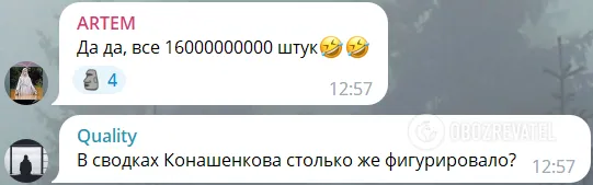 "33 Залужных и 54 Будановых еще", "Уничтожили заодно американский авианосец", "Верим, конечно же. И захватили 10 Зеленских", "Получается, танки Украине поставляют быстрее и больше, чем ВС РФ их уничтожает?" "Шойгу сам их своими руками на кусочки порвал", "Конашенков в курсе?" – шутят интернет-пользователи.
