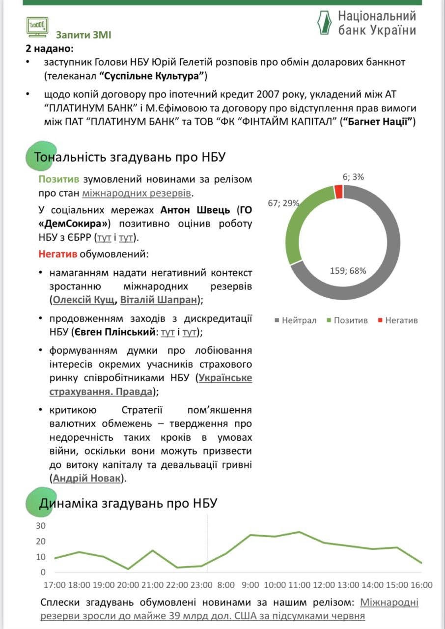 Обратите внимание, в мониторинге отмечено 67 положительных новостей о НБУ, но только посты Швеца вынесены в отдельный блок.