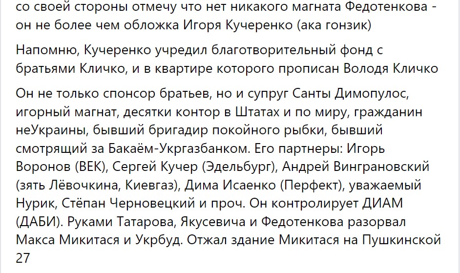 И вот на днях журналист Владимир Бондаренко опубликовал пост под заголовком «Гонзик» – серый кардинал Кличко», в котором шла речь о том, что Антимонопольный комитет возбудил дело за сговор на аукционе по передаче в аренду киевского коммунального «Житнего рынка» структурам, которыми на самом деле (через череду прокладок) владеет Игорь Кучеренко.