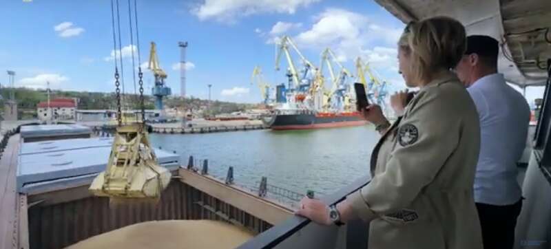 Юлия Максимова в порту временно оккупированного Мариуполя фотографирует воровство зерна, весна 2023 г., скриншот с видео на YouTube-канале РосКапСтрой