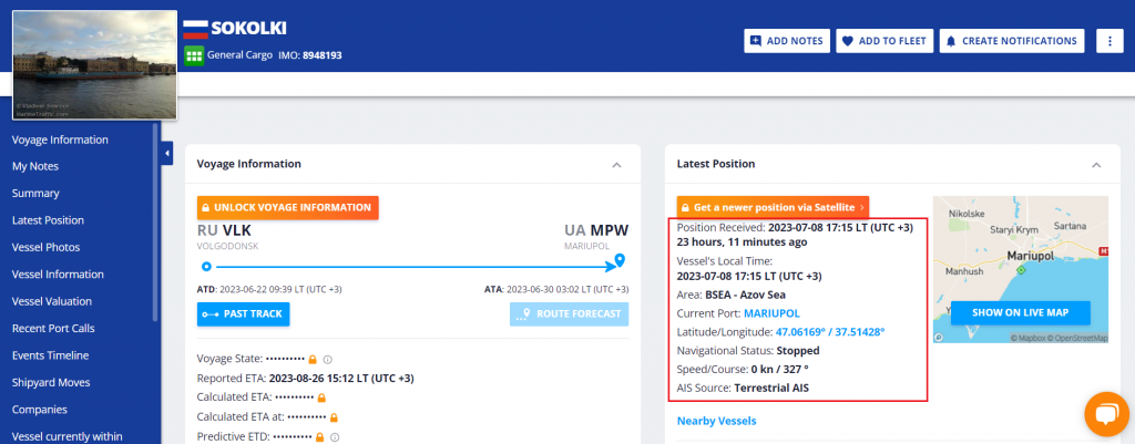 Судно Sokolki на сайте marinetraffic.com