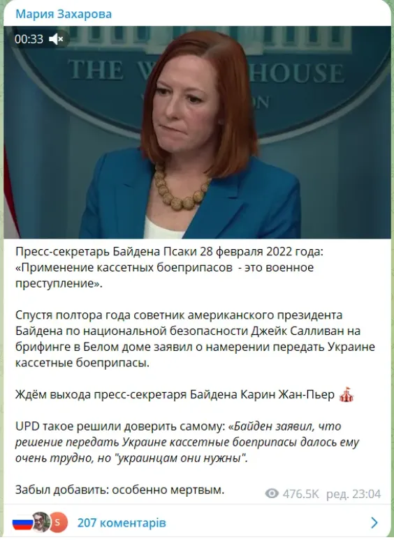 Первой эту же манипуляцию сразу после объявления Вашингтона о соответствующем решении озвучивала спикер МИД РФ Мария Захарова. Опубликовав фрагмент заявления Белого дома с фразой о том, что использование кассетных боеприпасов является преступлением, она "забыла" упомянуть, что тогдашняя пресс-секретарь Джо Байдена Джен Псаки сказала эту фразу, отвечая на вопрос об использовании Россией подобных боеприпасов в густонаселенных городах Украины. А это действительно можно расценивать как преступление.