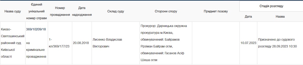 Что же касается вероятных приспешников авторитета в истории с киевским киднепингом уважаемых азербайджанцев, то еще в конце февраля 2019 года Аризмана Байрамова и Асифа Гасанова перевели из безальтернативного содержания под стражей на ночные домашние аресты . Рассмотрение обвинения в отношении этой парочки достойников и поныне продолжается в Киево-Святошинском дворце правосудия.