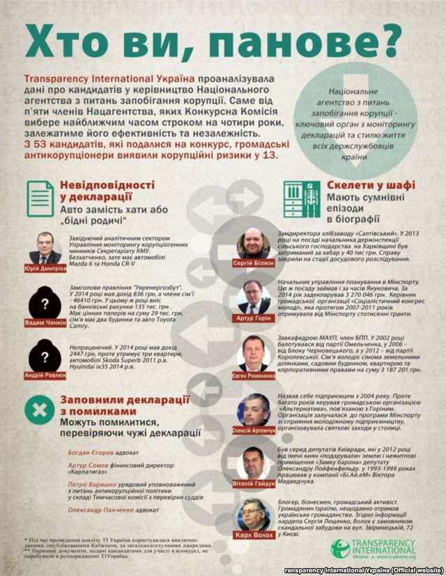 Паралельно аналіз резюме та декларацій кандидатів провела і «Transparency International Україна». Корупційні ризики активісти знайшли у кожного п’ятого. Зокрема, увагу привернули Сергій Бізікін, який за словами активістів займав посаду начальника Держінспекції сільського господарства на Харківщині, і був затриманий на хабарі розміром 40 тисяч гривень. Зосередили свою увагу і на Артурі Горіні. На сьогодні він є начальником управління планування у Міністерстві молоді та спорту. І цю ж посаду він обіймав і за часів Януковича. Крім того за 2014 рік Горін задекларував більше ніж 3 мільйони гривень.