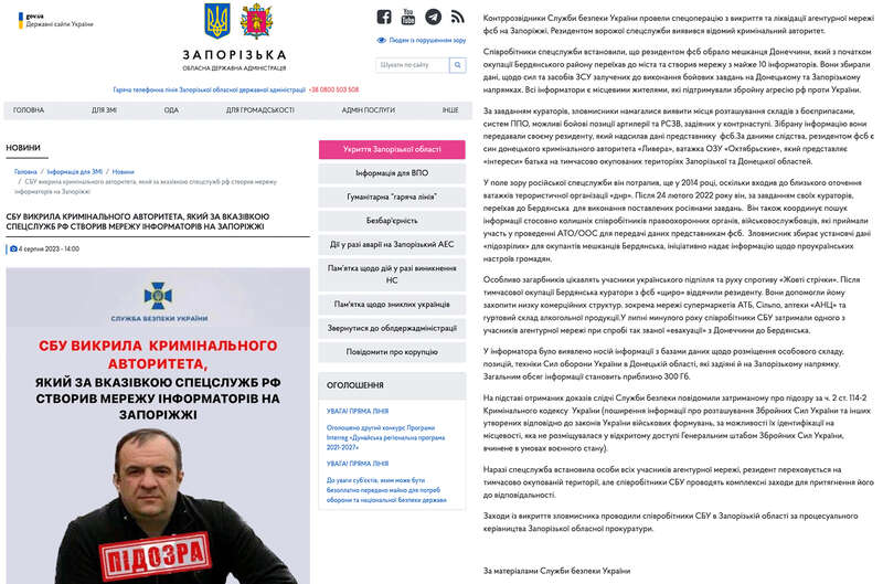 "В поле зрения российской спецслужбы он попал еще в 2014 году, поскольку входил в близкое окружение главарей террористической организации "ДНР". После 24 февраля 2022 года он, по заданию своих кураторов, переехал в Бердянск для выполнения поставленных россиянами задач", - отмечается в материале.