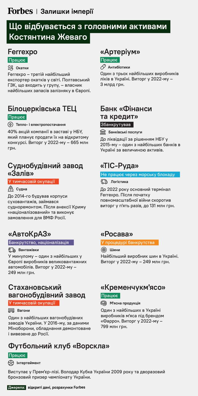 Главная задача Жеваго в 2023 году – защитить ключевой актив своей группы, Полтавский ГОК (ПГОК). Комбинат, который Жеваго взял под контроль в 1995–2002 годах, владеет самыми большими запасами железной руды в Европе. Это позволяет Жеваго входить в пятерку самых богатых украинцев. В 2021-м Forbes оценил его состояние в $2,4 млрд, в декабре 2022-го – в $1,4 млрд.