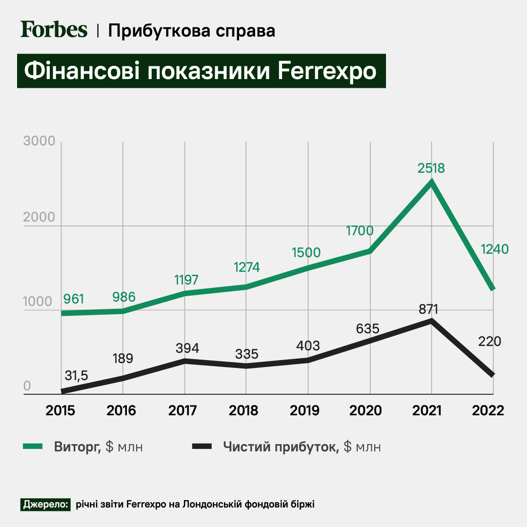 В 2022 году производство Ferrexpo упало на 46%. Доходы сократились на 50%, до $1,25 млрд, чистая прибыль – почти в четыре раза, до $220 млн. «Компания прошла год лучше, чем другие украинские металлурги», – говорит Сирык. Причина – в ориентации на восточноевропейский рынок и удаленности от зоны боевых действий, добавляет руководитель аналитического отдела ИК Concorde Capital Александр Паращий.